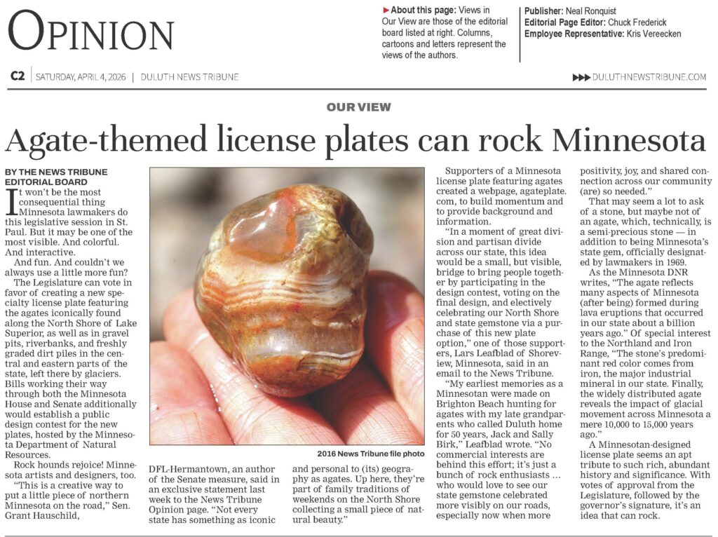 Thank you Duluth News Tribune editorial board for your Op-Ed, “Our View: Agate-themed license plates can rock Minnesota”. “A Minnesotan-designed license plate seems an apt tribute to such rich, abundant history and significance. With votes of approval from the Legislature, followed by the governor’s signature, it’s an idea that can rock.”