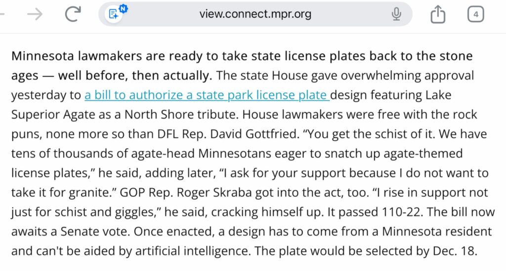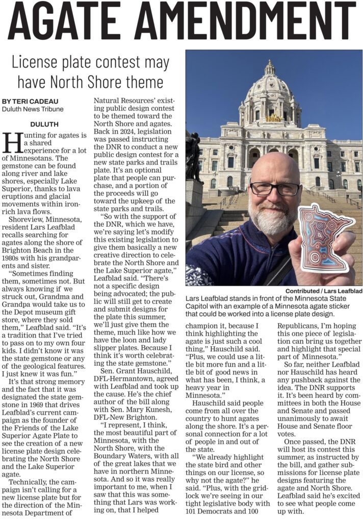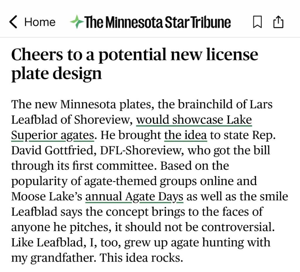 Thanks Karen Tolkkinen for sharing about our campaign in the Minnesota Star Tribune, “I see that Minnesota lawmakers are considering a license plate to celebrate agates. Good call! We Minnesotans are clearly passionate about our rocks.”