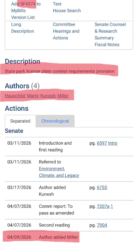 Thank you Senator Jeremy Miller (26) for joining us as a new author of SF4374 and creating formal bipartisan support for our campaign. We’re thrilled!! (See screenshot below confirming his authorship):