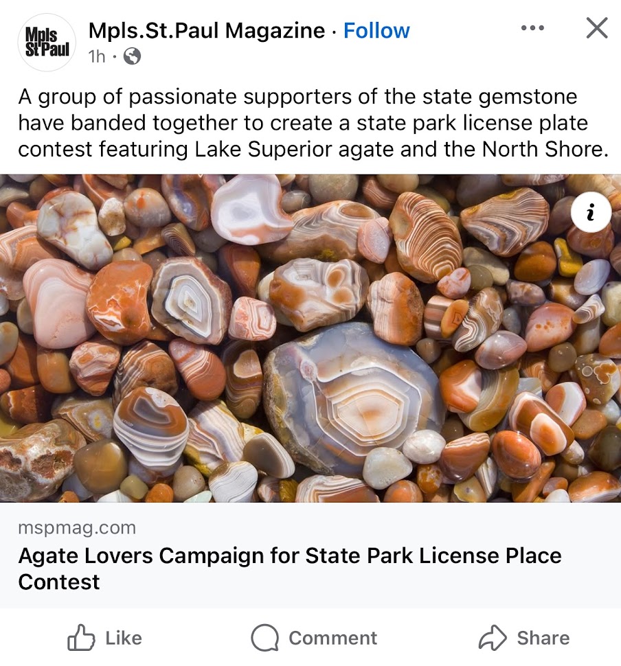 Thanks to Mpls. St Paul magazine for covering our campaign! Story –> https://mspmag.com/arts-and-culture/agate-lovers-campaign-state-park-license-place-contest/